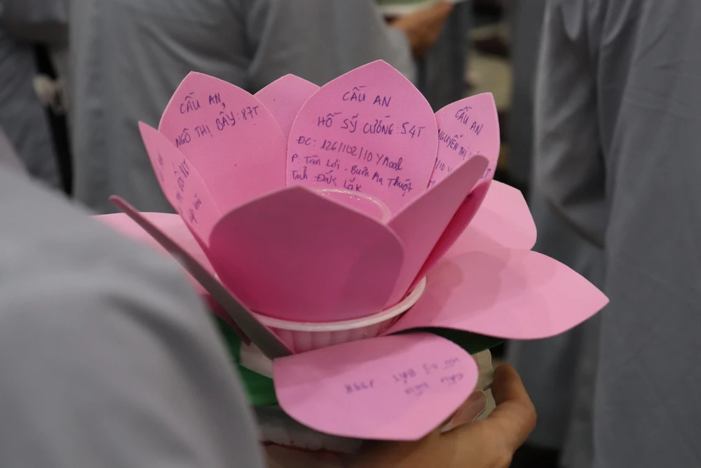Mỗi phật tử được phát miễn phí một đèn hoa đăng, sau đó ghi những điều ước tốt đẹp nhất rồi thả xuống dòng Sài Gòn. |