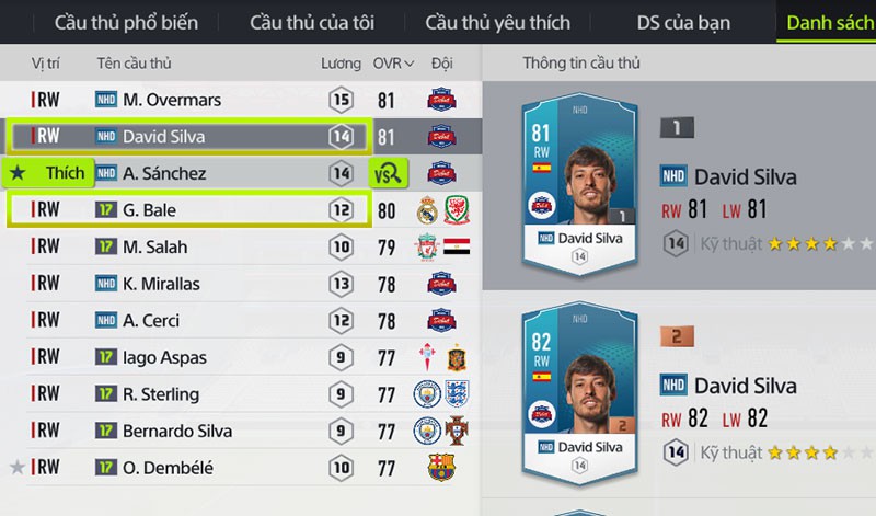 Nghe có vẻ đơn giản. Thực tế chứng minh những đội bóng phụ thuộc vào một vài ngôi sao chính rất mong manh dễ vỡ, điển hình như Argentina của Messi chẳng hạn. Đội hình dự bị cũng là một đề bài nan giải, yếu quá thì vứt. Vậy nên bạn phải nỗ lực ‘săn’ hàng chỉ số khá-tốt có hệ số lương thấp nhất có thể. Ví dụ G. Bale ‘17 so với D. Silva NHD chỉ số chênh lệch chỉ là 1 nhưng lương Silva 14 > 12 lương của Bale. Như vậy, bạn biết chọn ai rồi đấy! Chỉ có điều là giá của Bale sẽ chát hơn thôi.