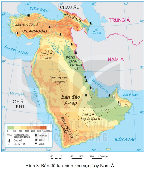 - Khoáng sản: chiếm 1/2 trữ lượng dầu mỏ thế giới. Phân bố chủ yếu: đồng bằng Lưỡng Hà, các đồng bằng bán đảo A-ráp, vùng vịnh Péc-xich.