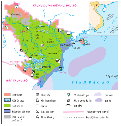 * Đặc điểm: châu thổ sông Hồng bồi đắp, khí hậu nhiệt đới có mùa đông lạnh, nguồn nước dồi dào, chủ yếu là đất phù sa, có Vịnh Bắc Bộ giàu tiềm năng.