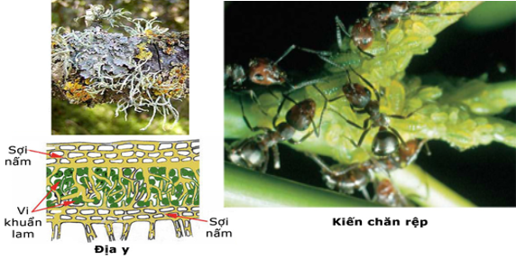 + Cộng sinh giữa tảo đơn bào với nấm trong địa y: Ở địa y, các sợi nấm hút nước và muối khoáng từ môi trường cung cấp cho tảo; tảo hấp thu nước, muối khoáng và năng lượng ánh sáng Mặt Trời tổng hợp nên các chất hữu cơ; nấm và tảo đều sử dụng sản phẩm hữu cơ do tảo tổng hợp.