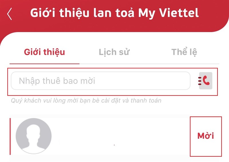 - Bước 3: Trong hộp văn bản, bạn nhập số điện thoại hoặc chọn từ danh bạ. Ứng dụng sẽ đề xuất cho bạn những số thuê bao sử dụng mạng Viettel để bạn dễ dàng mời. Khi đã xong, bạn nhấn "Mời" để gửi lời giới thiệu tới họ.