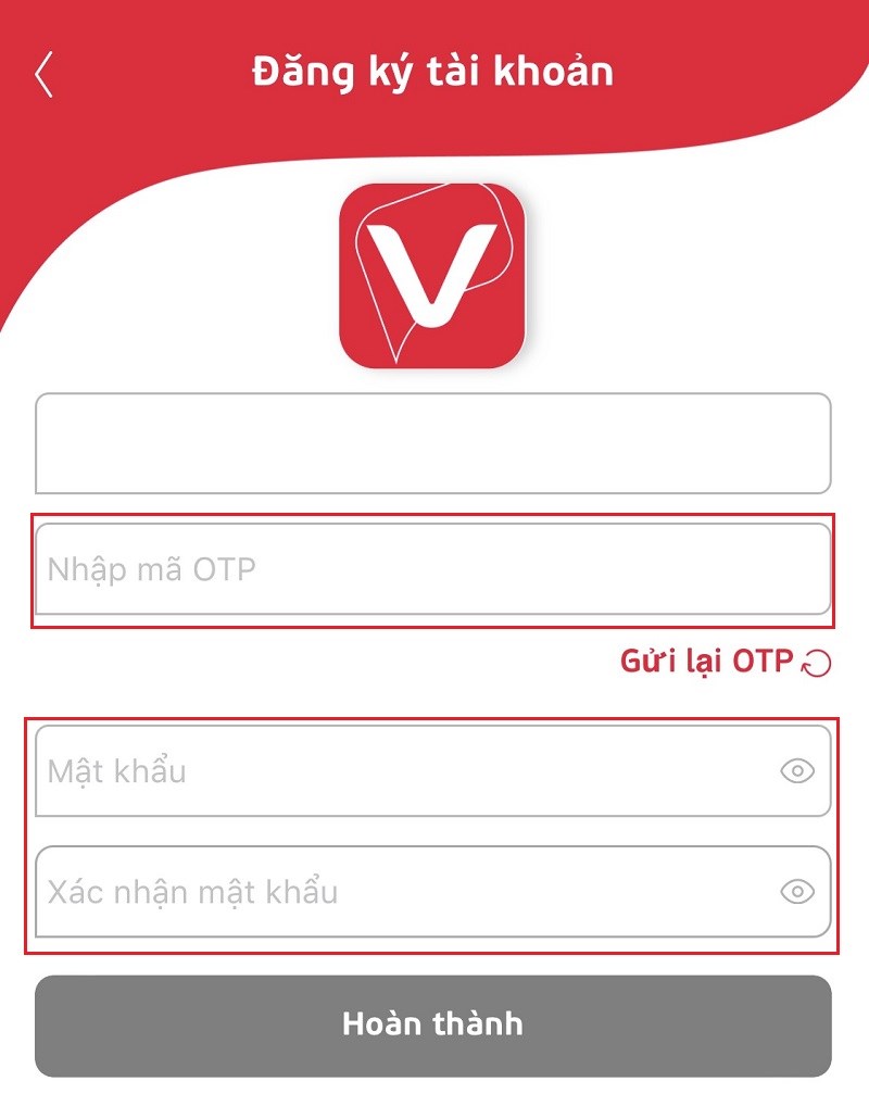 - Bước 4: Nhập mã OTP được gửi đến điện thoại của bạn, tạo mật khẩu mới và xác nhận lại mật khẩu. Bấm hoàn thành để hoàn tất đăng ký.