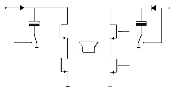 Bạn có thể quan sát sơ đồ mạch công suất class H cơ bản dưới đây để hiểu hơn về bộ mạch âm thanh class H này.