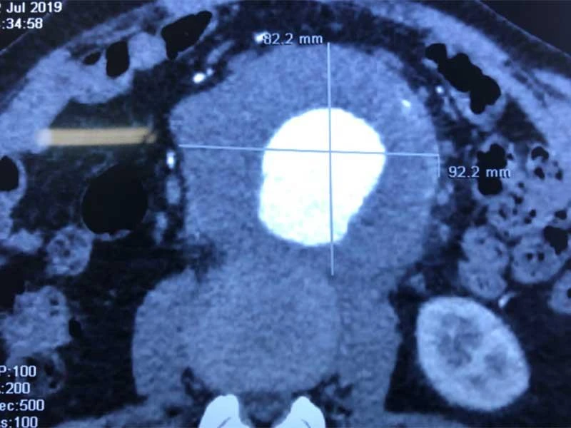 Tại đây, ông được chẩn đoán có túi phình kích thước 9 x 8,6 cm, như một trái bưởi nhỏ, nếu vỡ sẽ khiến một lượng lớn máu xòa ra trong ổ bụng, nguy cơ tử vong lên đến trên 90%. Sau hơn 2 giờ phẫu thuật, các bác sĩ đã loại bỏ trọn khối xơ vữa có trọng lượng 0,5 kg trong túi phình, đặt thành công ống ghép dacron (động mạch nhân tạo) vào động mạch chủ bụng thay thế cho đoạn bị phình giãn.
