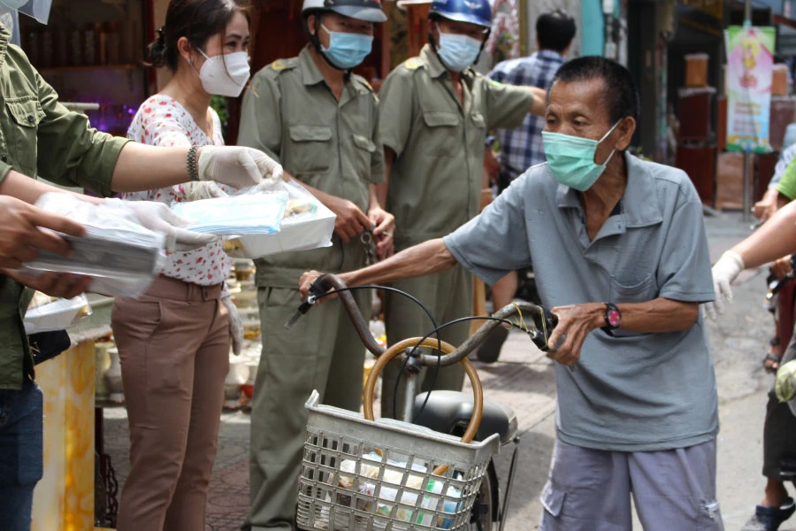 Khẩu trang, cơm chay được trao tận tay người nghèo tại 96 Nguyễn Chí Thanh, quận 10. Ảnh: NGỌC LÀI