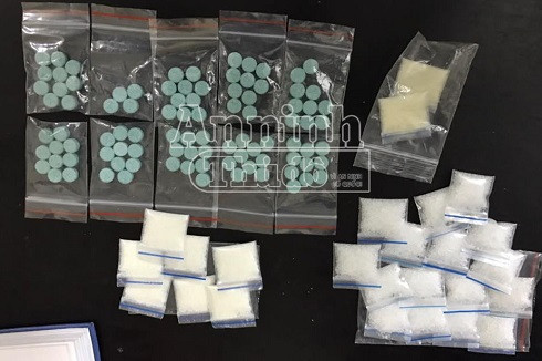 Tại đây, qua kiểm tra, tổ công tác phát hiện trong túi xách màu đen của hai nam thanh niên có một bọc ni lông to, bên trong chứa 94 viên nén màu xanh, bề mặt in chữ LV và 25 gói bột màu trắng. Ngoài ra, lực lượng chức năng còn thu giữ nhiều dụng cụ sử dụng ma túy đá và một bộ loa khuyếch đại âm thanh.
