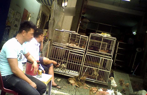 Cửa hàng của ông T. nằm ngay mặt đường, trong nhà rất nhiều lồng nhốt chó, mèo đủ loại từ vài triệu đến vài chục triệu đồng. Trên vỉa hè, khoảng 10 con chó được xích chung, nhiều con nằm mệt mỏi vì bị xích giữa nắng. Khi thấy người đến, chúng tất thảy đứng dậy vẫy đuôi mừng rỡ vì tưởng chủ. Còn ông T. đang ngã giá bán một chú chó gần 10 triệu đồng với một khách hàng.