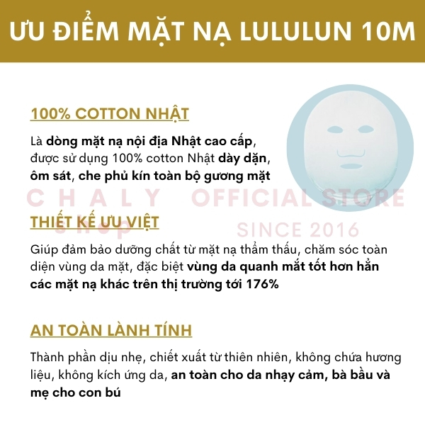 – Chất liệu mặt nạ Lululun mask là cotton Nhật 100%, lành tính, không kích ứng da