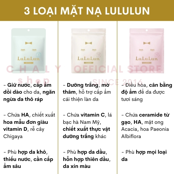 Shop Nhật Chaly cam kết cung cấp sản phẩm mặt nạ Lululun dưỡng ẩm, dưỡng trắng, trị nếp nhăn, chống lão hoá Nhật Bản và nhiều loại mặt nạ chăm sóc da Nhật nổi tiếng cực hot chính hãng 100%. Quý khách có thể đặt mua bằng các cách sau