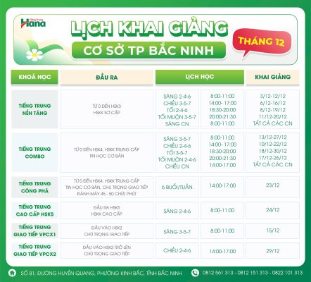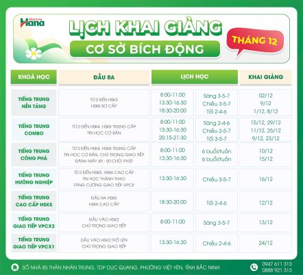 LỊCH KHAI GIẢNG cơ sở Bích Động tháng 12