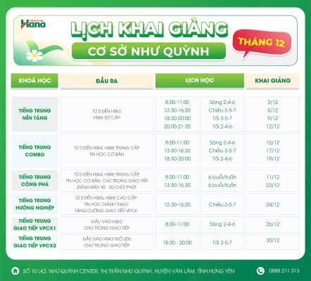LỊCH KHAI GIẢNG cơ sở Như Quỳnh tháng 12