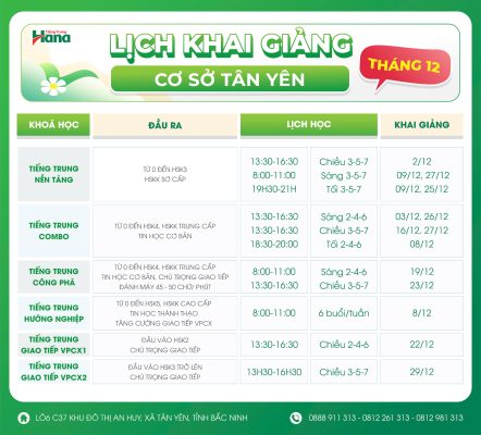 LỊCH KHAI GIẢNG cơ sở Tân Yên tháng 12