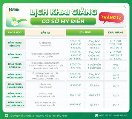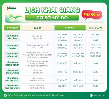 Lịch khai giảng cơ sở Mỹ Độ tháng 12
