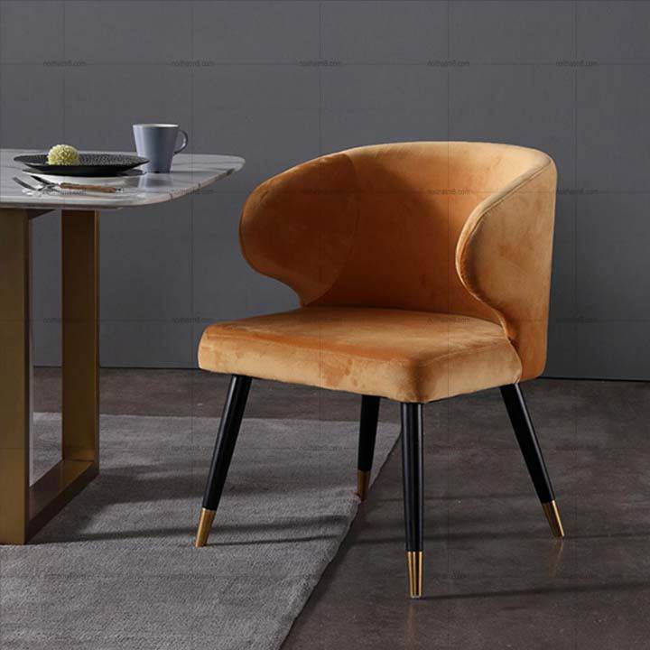 Về kiểu dáng, ghế ăn sang trọng nổi bật với chiều cao tổng thể 84cm, kết cấu ghế vững chắc với 4 chân trụ tạo sự cân bằng và cảm giác vững chắc an tâm khi ngồi. Khung nệm bọc vải nhung với độ cứng hoàn hảo giúp giảm thiểu cảm giác đau lưng, đau hông, giúp người ngồi luôn cảm thấy êm ái dễ chịu. Ngoài phần đệm ngồi vững chắc, ghế còn được bố trí khung đệm đỡ lưng liền phần đệm kê tay tại hai bên trái phải giúp người ngồi tựa lưng, kê đặt tay theo tư thế ngồi thư giãn nhất.