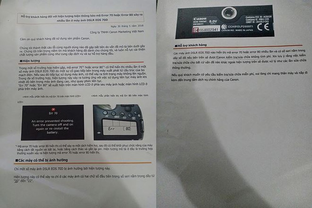 Còn theo bà Đỗ Lệ Hà, đại diện Canon Việt Nam: “Đối với thị trường Việt Nam số lượng máy hỏng Canon đã ghi nhận được là rất thấp. Từ trước đến giờ chỉ có khoảng 30 máy hỏng trên tổng số 20.000 máy bán ra đối với hàng chính hãng. Máy được sản xuất năm 2013 đến năm 2016 thì có nhận được thông tin phản hồi từ người dùng và Canon bắt đầu điều tra từ thời điểm đó. Hiện tại đến thời điểm này Canon Việt Nam mới tiếp nhận xử lý 8 trường hợp với lỗi chung là mất nguồn chứ không phải 100% lỗi Error 70 hay Error 80”.