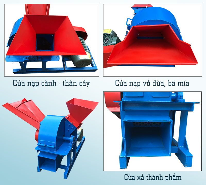 Máy được trang bị 2 cửa nạp nguyên liệu khác nhau phù hợp cho từng nguyên liệu sử dụng: - Cửa nạp dạng máng to rộng thuận tiện cho quá trình nạp nguyên liệu như bã mía, xơ dừa… - Cửa nạp dạng phễu được tính toán có độ sâu vừa phải đảm bảo an toàn cho người dùng tránh hiện tượng nguyên liệu bị bắn ngược trở lại. Cửa này chuyên dùng để nạp các cành cây, thân cây.