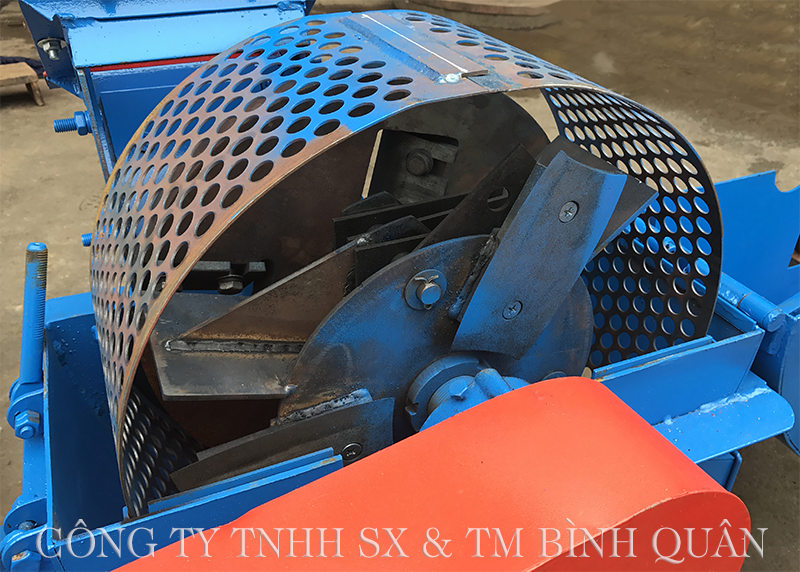 Buồng làm việc được thiết kế thấp thuận tiện cho quá trình nạp nguyên liệu cũng như hạn chế rung lắc. Bên trong được trang bị bộ phận bánh đà gắn 4 lưỡi dao nhỏ giúp băm thô nguyên liệu dễ dàng. Kết hợp với hệ thống 3 con dao to 2 lưỡi sắc bén bằng thép rèn và 12 búa đập chắc khỏe có nhiệm vụ băm nhỏ vụn nguyên liệu.