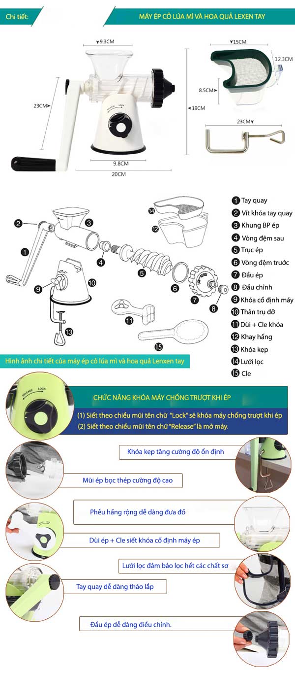 Máy ép cỏ lúa mì và hoa quả lexen tay là loại máy ép tốc độ chậm được ưa chuộng nhất hiện nay trên thị trường. Máy ép cỏ lúa mì và hoa quả lexen tay nhỏ gọn, dễ dàng tháo lắp và vệ sinh. Ngoài công dụng ép lấy nước cỏ lúa mì, máy có thể dùng để ép nước rau xanh, củ quả hoặc lá sen…