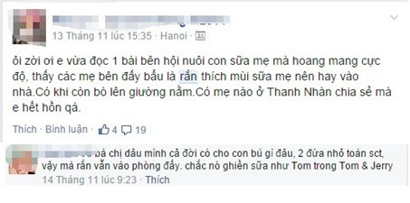 Thu Minh 22/11/2014 06:10 Những tin đồn đó trên các diễn đàn mạng đang làm nhiều bà mẹ trẻ hoang mang và sợ hãi cực độ. Chị Ngân Lê ở Trường Chinh, Đống Đa, Hà Nội chia sẻ: "Hiện tại tôi rất sợ hãi khi đọc đươc thông tin rắn rất thích mùi sữa đặc biệt là sữa mẹ nên thường theo mùi sữa bò vào nhà. Thậm chí chúng còn cuộn nằm ngủ trên giường còn vương mùi sữa... được chia sẻ trên Hội nuôi con bằng sữa mẹ và một số hội dành cho các bà mẹ khác trên mạng xã hội facebook". Theo chị Lê, khi mới đọc tin chị nghĩ nó là nhảm nhí đồn bậy nhưng sau đó nhiều bà mẹ khác cũng khẳng định là rắn thích sữa mẹ, thích uống sữa. Vì thích sữa nên nhà có em bé đang bú sữa mẹ rắn thường hay bò vào khiến chị càng hoang mang vì mình mới sinh con nhỏ. Thậm chí vì sợ hãi chị không dám đưa con về quê ngoại ở Hà Nam vì sợ vùng sông nước gần ruộng nhiều rắn nó sẽ bò vào nhà nguy hiểm cho con mình.![]() |