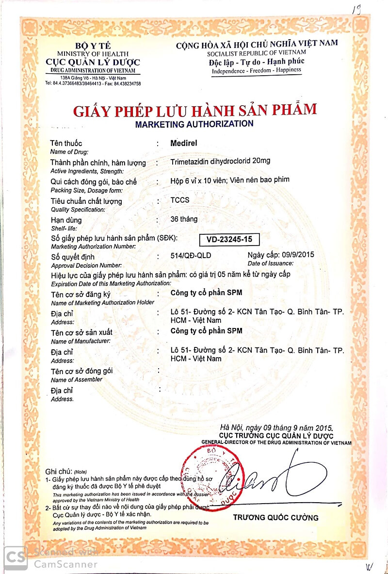 Medirel Bổ sung/hỗ trợ vào biện pháp trị liệu hiện có thể điều trị triệu chứng đau thắt ngực ổn định không được kiểm soát đầy đủ hoặc bệnh nhân không dung nạp với các liệu pháp điều trị đau thắt ngực khác... được Cơ quan quản lý nhà nước cấp giấy xác nhận công bố lưu hành trên toàn quốc, Số:VD-23245-15