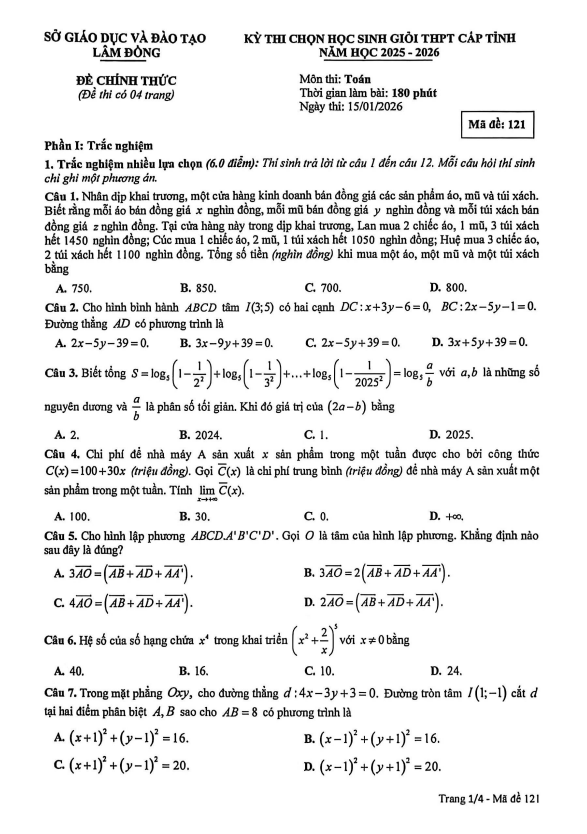 Đề chọn học sinh giỏi tỉnh Toán THPT năm 2025 – 2026 sở GD&ĐT Lâm Đồng 16/01/2026
