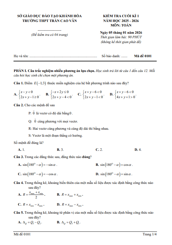 Đề cuối kì 1 Toán 10 năm 2025 – 2026 trường THPT Trần Cao Vân – Khánh Hòa 16/01/2026