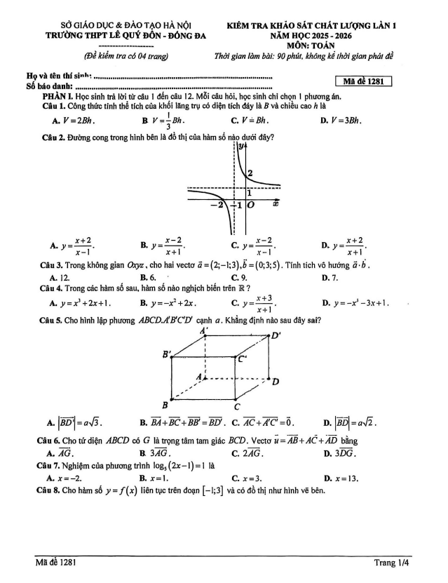 Đề khảo sát Toán 12 lần 1 năm 2025 – 2026 trường THPT Lê Quý Đôn – Hà Nội 16/01/2026