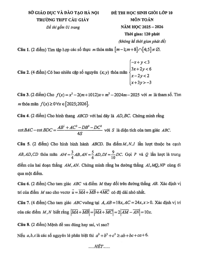 Đề thi học sinh giỏi Toán 10 năm 2025 – 2026 trường THPT Cầu Giấy – Hà Nội 16/01/2026