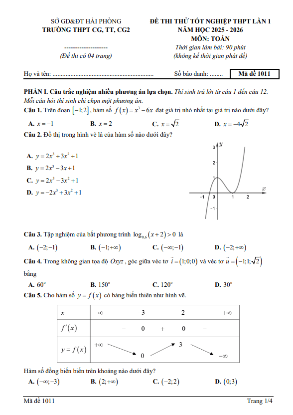 Đề thi thử TN THPT 2026 lần 1 môn Toán trường THPT CG-TT-CG2 – Hải Phòng 16/01/2026