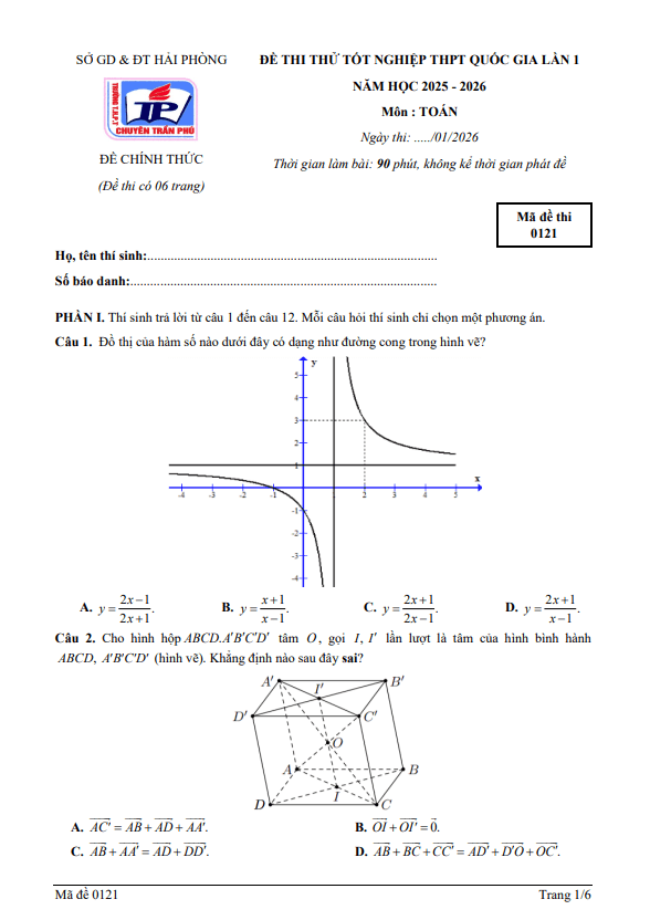 Đề thi thử TN THPT 2026 lần 1 môn Toán trường THPT chuyên Trần Phú – Hải Phòng 16/01/2026
