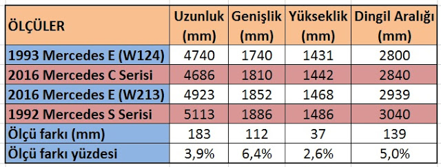 Mercedes’in en önemli modellerinden birisi olan E Sınıfı yakın bir zaman önce yenilendi ve jet hızı ile ülkemizde satılmaya başlandı. E segmentinde genellikle ezeli rakipleri Audi A6 ve BMW 5 Serisi ile kıyasıya rekabet eden modelin konfor özellikleri öne çıkıyor. Geçmiş yıllardan beri tüm dünyada büyük ilgi çeken modelin ülkemizde de sayısız hayranı bulunuyor. Yeni E Sınıfı Türkiye fiyatları ve motor seçenekleri açıklandı 1993 yılı öncesinde 200, 230, 200E, 230E, 300E gibi motor odaklı uzantılarla tanımlanan model daha sonra değişen trendlerle beraber 1993 yılından beri “E Class” yani “E sınıfı” olarak adlandırılmaya başlandı. Motor eki de E harfinden sonra geldi. Ayrıca bu işlemin yapıldığı 1993 yılında model makyajlandı. Diğer taraftan günümüzde C, E ve S sınıfları birbirlerine tıpatıp benzedi. Rusların iç içe geçmiş tahta bebeklerine verilen isim ile adlandırılmaya başlanan bu Matruşka bebek trendi artık günümüzün bir tasarım gerçeği haline geldi. Ancak 80’li ve 90’lı yıllarda durum daha farklıydı ve çok daha özgün modeller ortaya çıkıyordu. Şüphesiz ki Mercedes W124 kasa E Serisi de bunlardan birisiydi. Yeni Mercedes E Sınıfı küçük S mi, büyük C mi? Ölçü Karşılaştırması Ölçüler kısmında boyutlardaki değişimi daha net görebilmek için hem W124’ün döneminde bulunan ve bir üst sınıfta yer alan S sınıfını hem de bir alt sınıfta yer alan günümüz C Sınıfını karşılaştırmaya dahil ediyoruz. Günümüzde yer alan E sınıfı 23 yıllık dönemde 4 farklı ölçünün ortalaması alındığı zaman %4.5 oranında büyümüş. Öyle ki geçmiş dönemin S sınıfı ile arası neredeyse kapanmış bile diyebiliriz. Hatta bir sonraki E Sınıfının 1992 model S Sınıfı ölçülerini yakalayabilir varsayımını bile yapabiliriz. Diğer taraftan günümüz C Sınıfının, uzunluk hariç diğer tüm ölçülerde 1993 model W124 kasa E Sınıfını geçtiğini de tablodan açıkça görebiliriz. Bu da D Segmentinde bulunan araçların giderek E Segmentinde bulunan araçların ölçülerine yaklaştığını gösteriyor. Daha önce yaptığımız geçmiş dönem-günümüz Ford Mondeo karşılaştırmasında da bunu açıkça görmüştük. Ford Mondeo 25 yıl önce nasıldı? Şimdi nasıl?