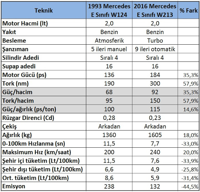 Teknik Karşılaştırması Aradaki çeyrek asır farkı daha rahat görebilmek için uzantıları ve motor hacimleri aynı olan E200 modellerini karşılaştırmayı uygun gördük. Her iki model de 2.0 litre 4 silindirli 16 supaplı ve bulundukları dönemin giriş seviyesi benzinli motorlarına sahipler. Yapı olarak tek farkları 1993 model de hava emişi atmosferik olarak gerçekleşirken 2016 modelde hava emişi turbo ile aşırı olarak gerçekleşiyor. Ancak tabii ki fark sadece hava emiş tipiyle sınırlı değil. Temel motor yapısı benzer olsa da teknolojik gelişmeler çok ciddi. Atmosferik motor ile turbo motor arasındaki farklar nelerdir? Bu farklılıklar tablodan da açık bir şekilde görünüyor. 2016 E Sınıfı yaklaşık 250kg daha ağır bir araç fakat turbo beslemenin de etkisi ile daha fazla güç ve tork üretiyor. Ancak aradaki güç farkı çok fazla sayılmaz. Bu güç turbo motora sahip 2.0 litre bir araç için düşük bile sayılabilir. Güç/ağırlık oranının düşük sayılabilecek bir oranda artmasından da bu anlaşılabilir. Esas olarak bir motorun kasaya göre performansını bu değer ile kontrol etmek en mantıklısı diyebiliriz. Diğer taraftan hacmine göre çok iddialı bir güce sahip olmamasına rağmen performans ve tüketim olarak güç/ağırlık oranının çok üstünde bir oranla 1993 E Serisi’ne göre hissedilir derecede daha iyi performans verilerine sahip olduğu görülebilir. Ayrıca Hem daha ağır, hem de daha güçlü olmasına rağmen ortalama tüketim değeri 1993 modele göre üçte bir oranında daha düşük. Bu durumda sadece motorun değil daha verimli çalışan 9 ileri otomatik şanzımanın da etkisi oldukça büyük. Ayrıca daha aerodinamik yapının ve günümüz lastik teknolojisinin de verimli ve uyumlu çalışmada payı yadsınamaz. Günümüz E Serisi 0.23 Cd değerine sahipken 1993 E Serisi 0.28 değerine sahip. 0.28 değeri dönemi için çok iyi sayılabilir ancak 0.23 değeri günümüz için bile muhteşem bir değer. Not: Rüzgar direnç değeri (Cd) motor tipine ve lastik ölçüsüne göre değişmektedir ve serilerde bulunan en düşük değerler alınmıştır. Ayrıca 1993 E200 modelinin tüketim değerlerinde farklılıklar bulunabilir. Aerodinamik nedir? Cw ve Cd ne anlama gelir?