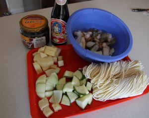 Giai đoạn xào rau củ:Bắc chảo cho 3 muỗng canh dầu ăn, lần lượt cho 1 muỗng cafê tỏi băm, rau củ vào xào đều. Kế tiếp cho Seafood mix. Nêm vào: – 2 muỗng canh dầu hào – phần tương jajang đã xào sơ hồi nãy vào. Xào chừng vài ba phút thì cho 2 chén nước sôi 500ml vào nấu lửa riêu riêu chừng 10 phút.