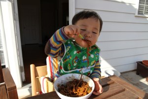 Nhóc tì ăn mì tương đen đây. Các mẹ nào cho con ăn món này phải biết là sau đó công đoạn chùi rửa cũng rất cực. Nhưng cứ để bé ăn và nghịch thoải mái cho vui.