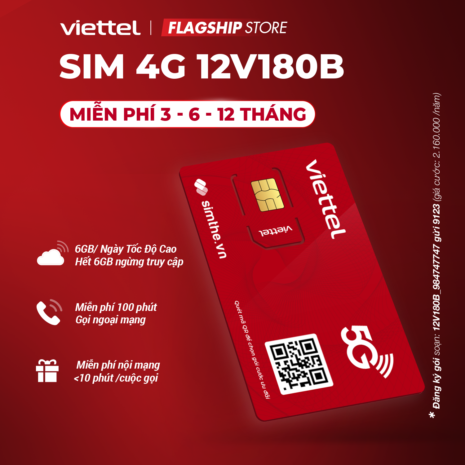 Giới thiệu [FREE 1 NĂM] SIM 4G VIETTEL 12V180B 6GB/Ngày (180GB/Tháng) + Miễn Phí 100 Phút Gọi Ngoại Mạng + 1 Tỷ Phút Nội Mạng. Trọn Gói 12 Tháng Không Cần Nạp Tiền. Được Bán Tại SimTheVN - Hàng Chính Hãng