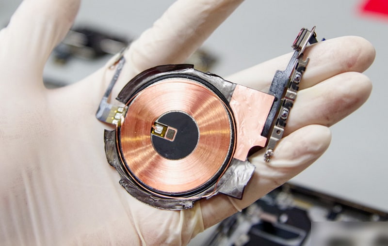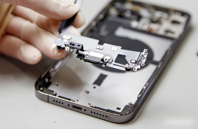 Phía sau mắt lưng của máy sẽ là mạch sạc không dây và vòng nam châm hỗ trợ kết nối cho tính năng sạc MagSafe. Mạc sạc không dây được kết nối với hệ thống dây nguồn, nút tăng giảm âm lượng.