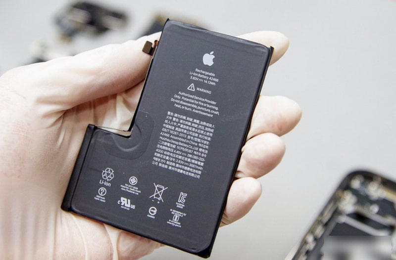 Viên pin iPhone 12 Pro Max có thiết kế chữ L, chiếm phần lớn không gian máy. Viên pin này có dung lượng là 3.687mAh, thấp hơn iPhone 11 Pro Max khoảng 10%.
