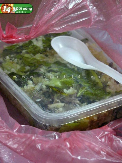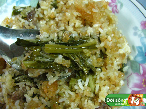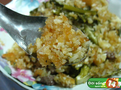 Còn phần cơm thì được rang kĩ ở lửa to nên xém vàng gần như hết tất cả. Ăn vào thấy giòn giòn, vui miệng. Do cơm được rang cháy nên cảm giác khi ăn cũng gần giống như ăn cháy í. Nhưng được cái là đậm đà và đa hương, đa vị hơn cháy nhiều.