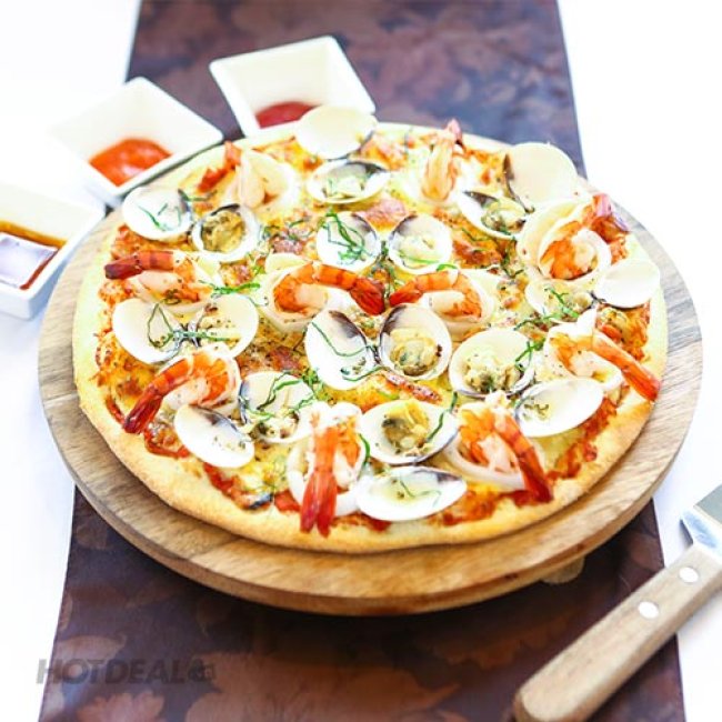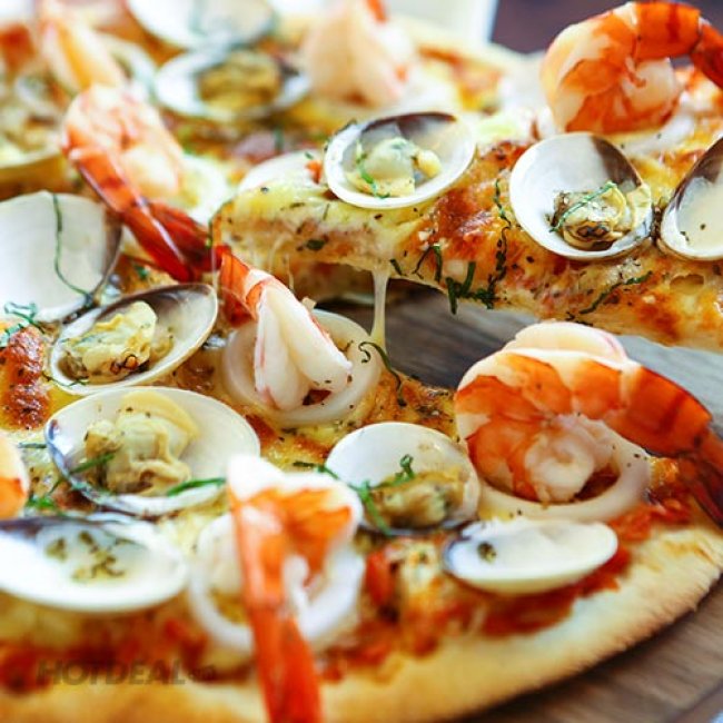 Đầu tiên phải kể đến gần 20 loại bánh pizza Ý trứ danh làm say lòng bất cứ thực khách nào ngay lần đầu tiên thưởng thức. Pizza của nhà hàng được nướng bằng than củi một cách công phu và tỉ mỉ, được thực hiện bởi đầu bếp đã từng làm nên chiếc bánh pizza kỷ lục Việt Nam năm 2008 tại Đầm Sen. Công nghệ nướng bánh và nhào bột đều được làm thủ công để bột nở xốp và giòn, không chai cứng, đế bánh mỏng và tươi. Lớp phô mai được sức nóng từ lò nướng đun củi làm tan chảy đều, tạo thành một lớp lót vàng mịn. Đế pizza vàng ruộm, nổi lên trên chiếc bánh là mực, tôm, nghêu, sò điệp, ớt xanh, hành đỏ… nhìn rất bắt mắt. Khi cắn một miếng, bạn sẽ phải trầm trồ thích thú với sự pha trộn giữa cái giòn tan, rất thơm của bột mì tươi, hòa quyện là mùi thơm, vị béo và ngọt lịm của những loại hải sản tươi sống… ngon không thể cưỡng lại.
