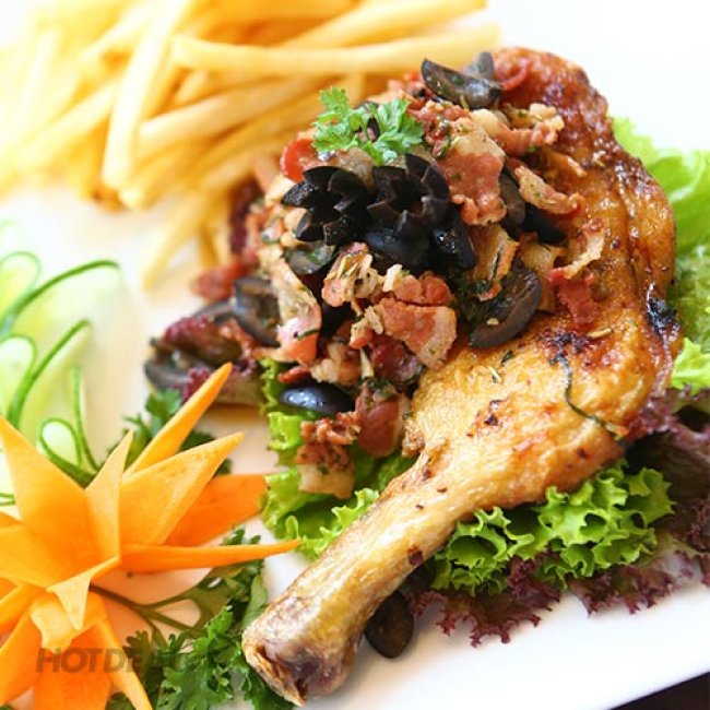 Tiếp đến là các món gà: Gà Ý nướng cay, đùi gà Ý đút lò, gà nướng mật ong, đùi gà Pháp rô ti, ức gà sốt cà chua đút lò… tất cả đều được chế biến và tẩm ướp công phu theo đúng hương vị Âu đích thực. Nhìn những miếng thịt gà vàng ruộm, bên trên được dưới lên một lớp nước sốt sẫm màu bắt mắt, thịt ngọt mềm, da giòn giòn dai dai hòa quyện cùng vị đậm đà của nước sốt cực ngon mà không hề tạo cảm giác ngán.