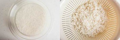 Vo sạch gạo rồi cho vào một cái bát, ngâm gạo với nước qua đêm sau đó lấy gạo ra để cho ráo nước. |