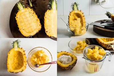Bổ đôi quả dứa theo chiều dọc, dùng dao cắt vào thịt dứa thành các ô vuông, sau đó dùng muỗng múc thịt dứa ra bát, bạn múc thịt dứa sao cho vỏ dứa còn lại dày khoảng 1,5cm và tạo thành hình dạng một cái bát. Tiếp đó trút dứa vừa múc vào một cái rây, bóp qua để tách nước dứa ra. |