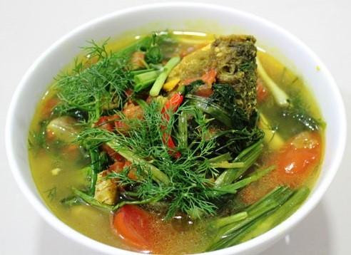 Nếu canh cá nấu với dọc mùng thì phải sơ chế dọc mùng bằng cách tước vỏ, thái vát, bóp với muối và rửa sạch bằng nước lạnh cho khỏi ngứa. Khi nồi canh sủi tăm là cá chín thì thả dọc mùng rồi bắc ra, nêm nếm lại một lần nữa rồi các loại gia vị như hành hoa, thìa lá thái nhỏ rắc lên bát ăn nóng.