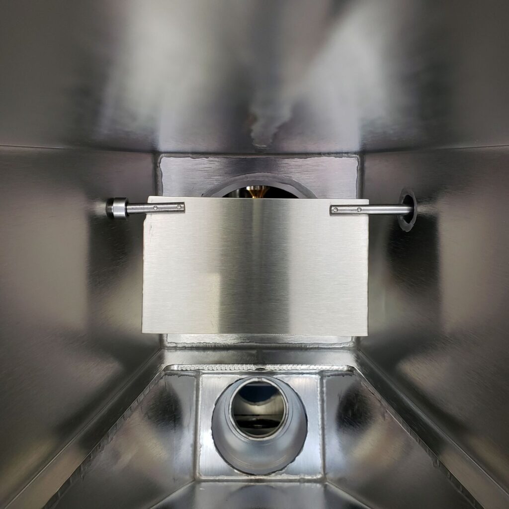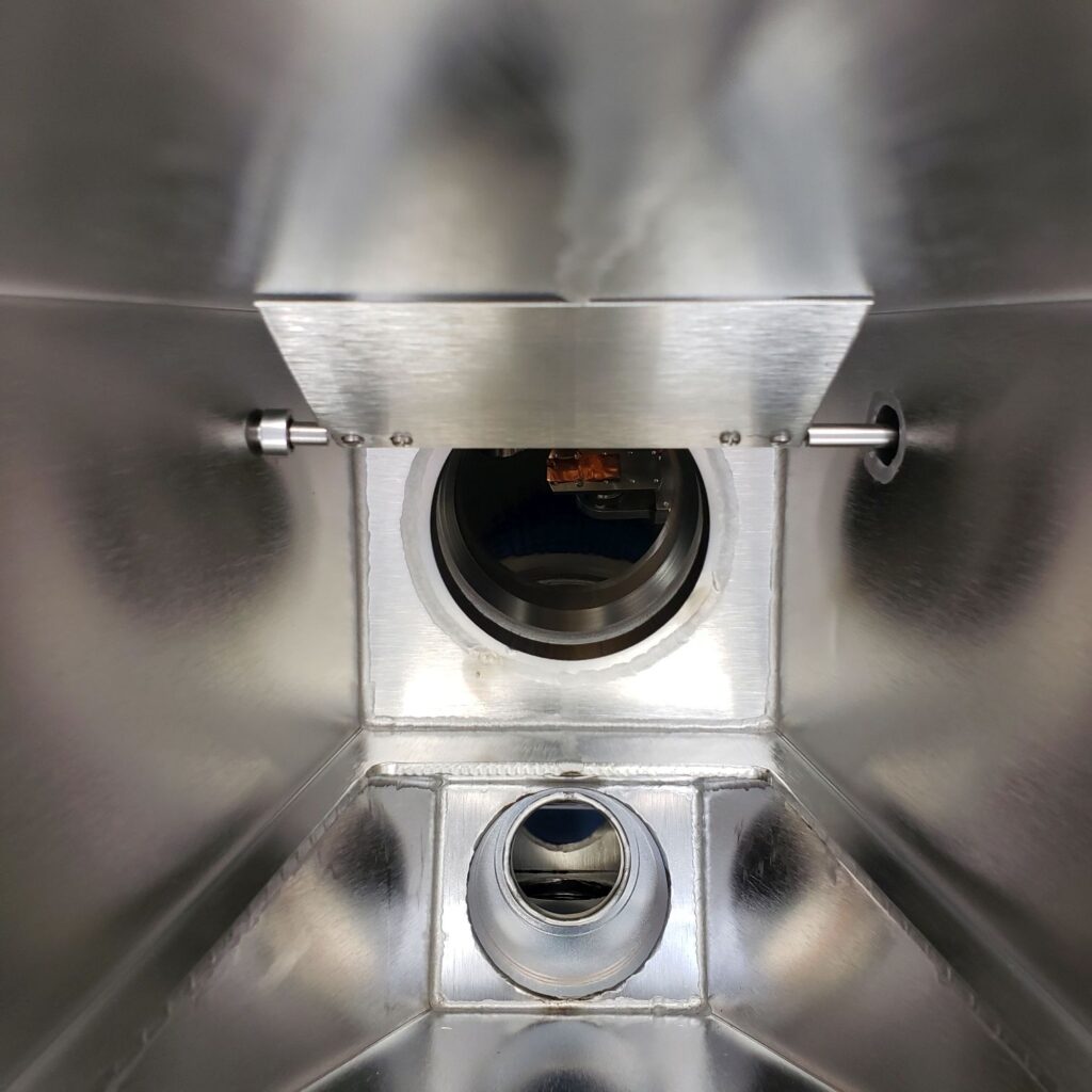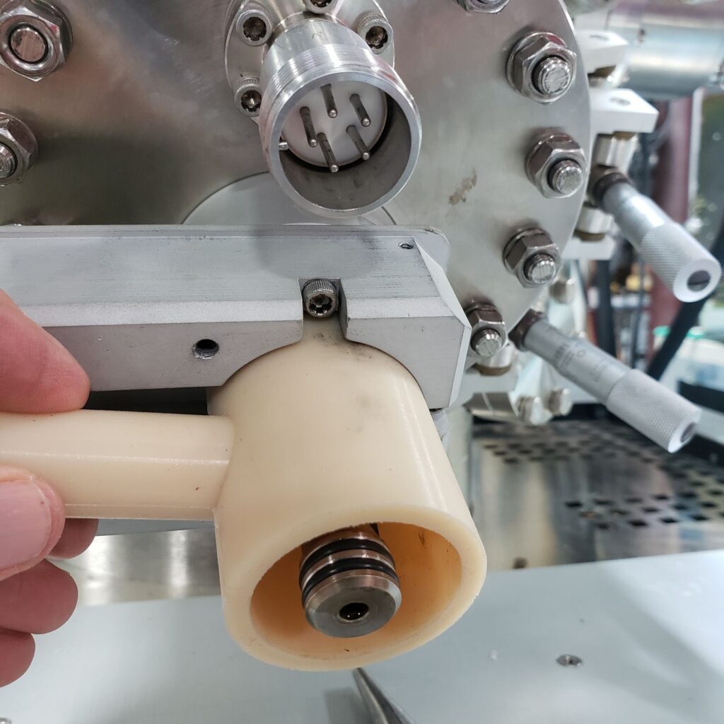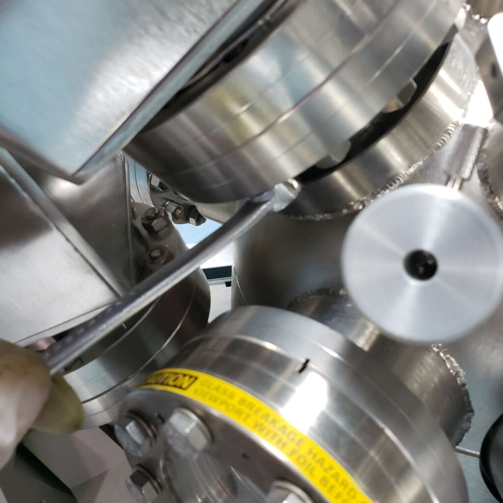 Put the mono housing shutter in the bakeout position. The chamber will be baked out and so the shutter will need to be set prior to the bake out. Also, you can see how the shutter works before the top mono flange is installed.