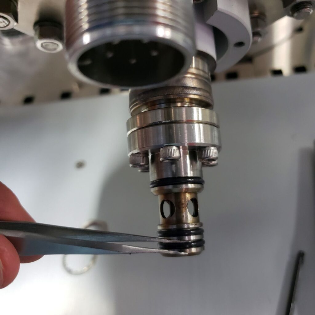 Next, install a new rectangular Helicoflex type monochromator gasket into the top of the monochromator housing. It will sit into a recess and should be centered in the recess.