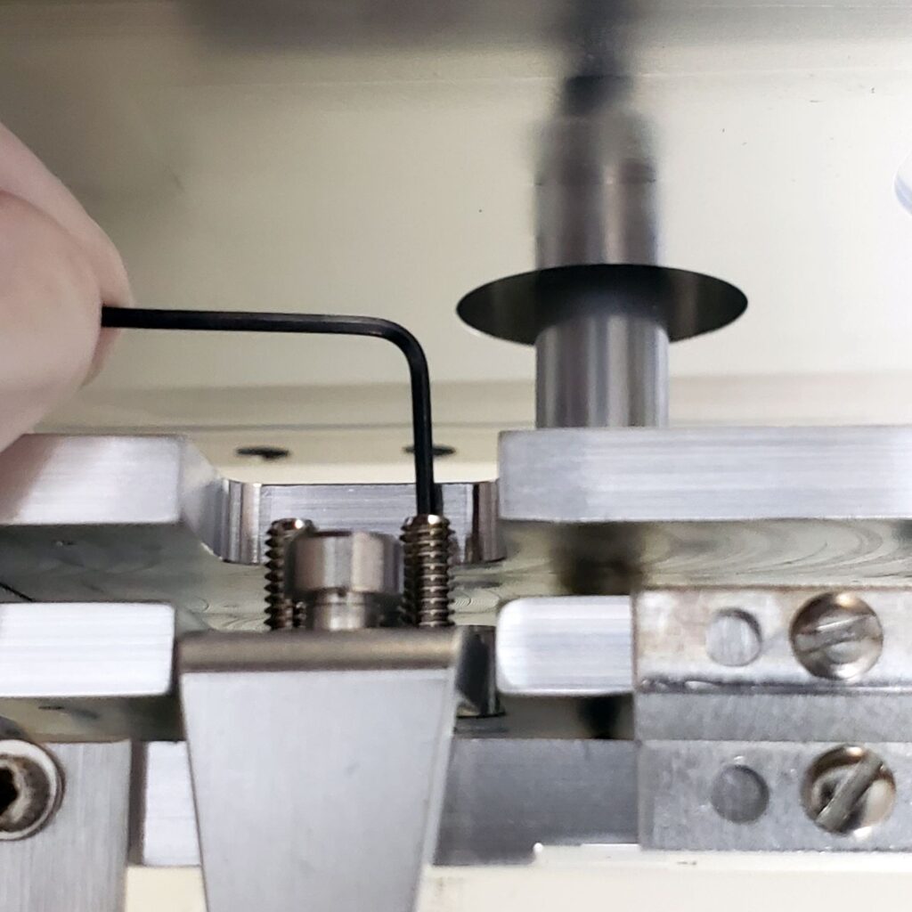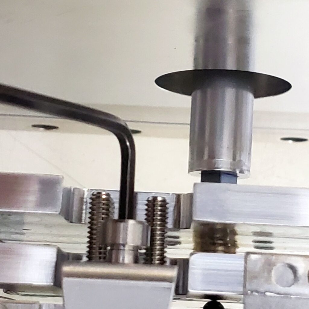 Tighten the set screws to where they just start to tighten up, and then about 1/16” more. Do not over-tighten the set screws. They should be tight enough to hold the crystal substrate in place firmly, but not so tight that the springs inside the set screws are fully compressed.