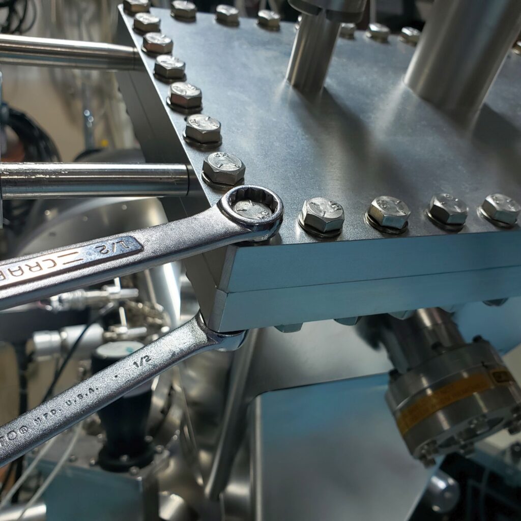 Once mounted tighten the nuts on the flange. In my experience, going in a circular pattern is the best way to tighten flanges on UHV chambers. The trick is to not over-tighten the nuts or bolts as you go around. Start out with just a little bit of torque and gradually increase it as you go around. One or two of the nuts on the back of the monochromator housing are exceedingly difficult to get to. A ½” U-shaped or half-moon wrench makes getting to those nuts easier.