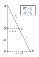 \(\Delta AO'C\) và \(\Delta AOB\) đồng dạng nên \({{{l_2}} \over {{l_1} + {l_2}}} = {a \over b} \Rightarrow {l_2} = {a \over {b - a}}{l_1} = {5 \over {10 - 5}}{l_1} = {l_1}\)