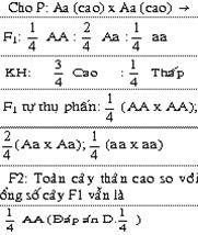 Đáp án này chỉ đúng với câu dẫn là: “Theo lý thuyết, tỷ lệ cây F1 tự thụ phấn cho F2 gồm toàn cây thân cao (tính trên số lượng lớn cá thể) là (...)